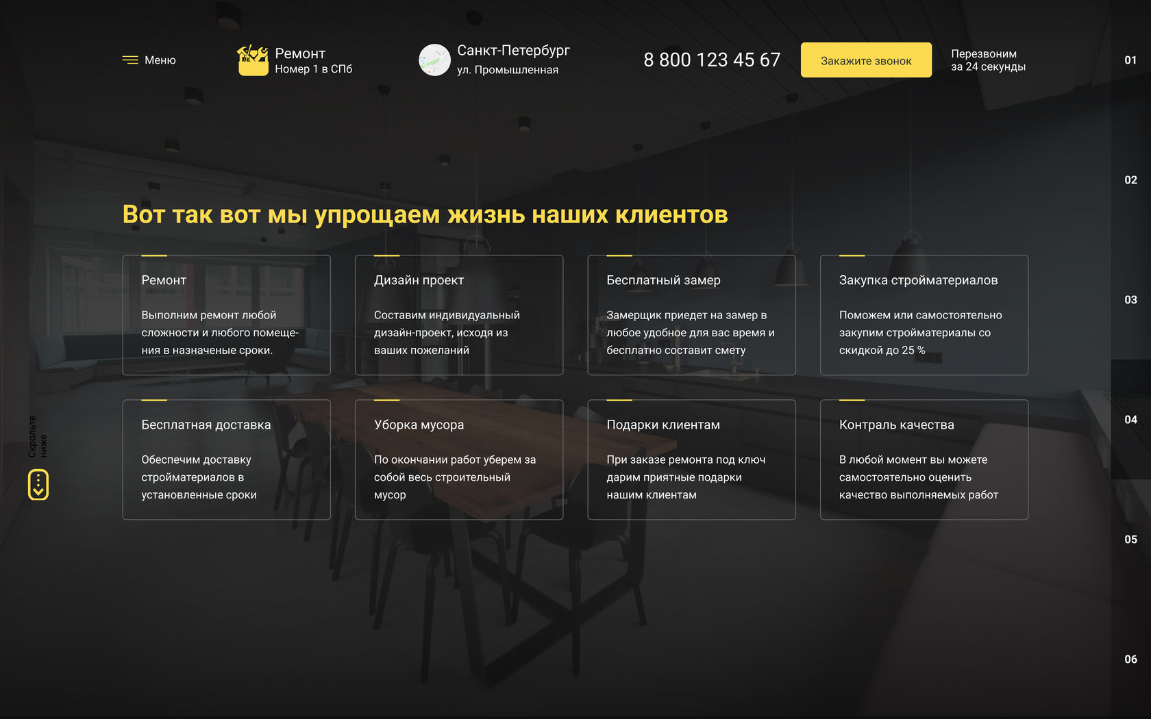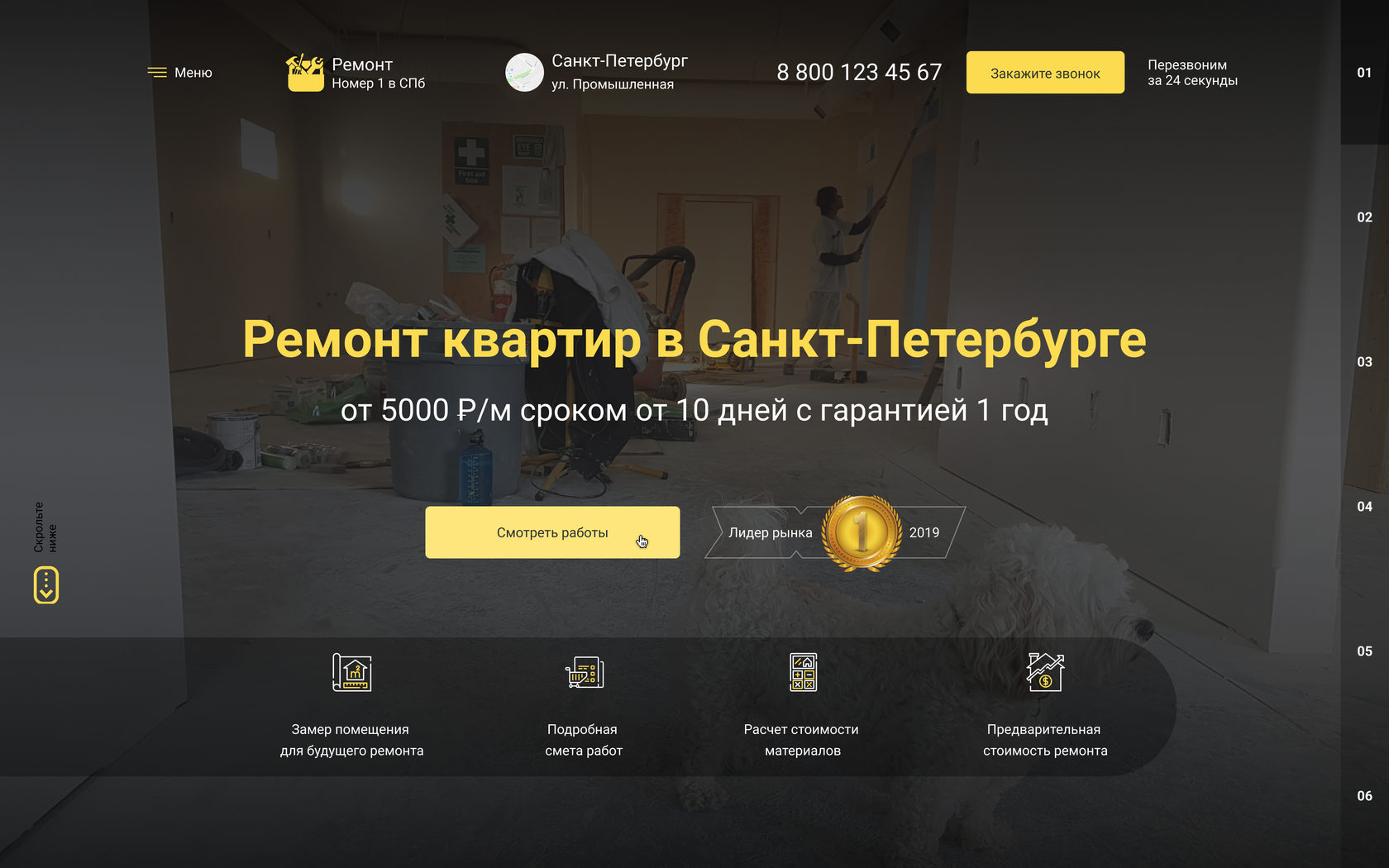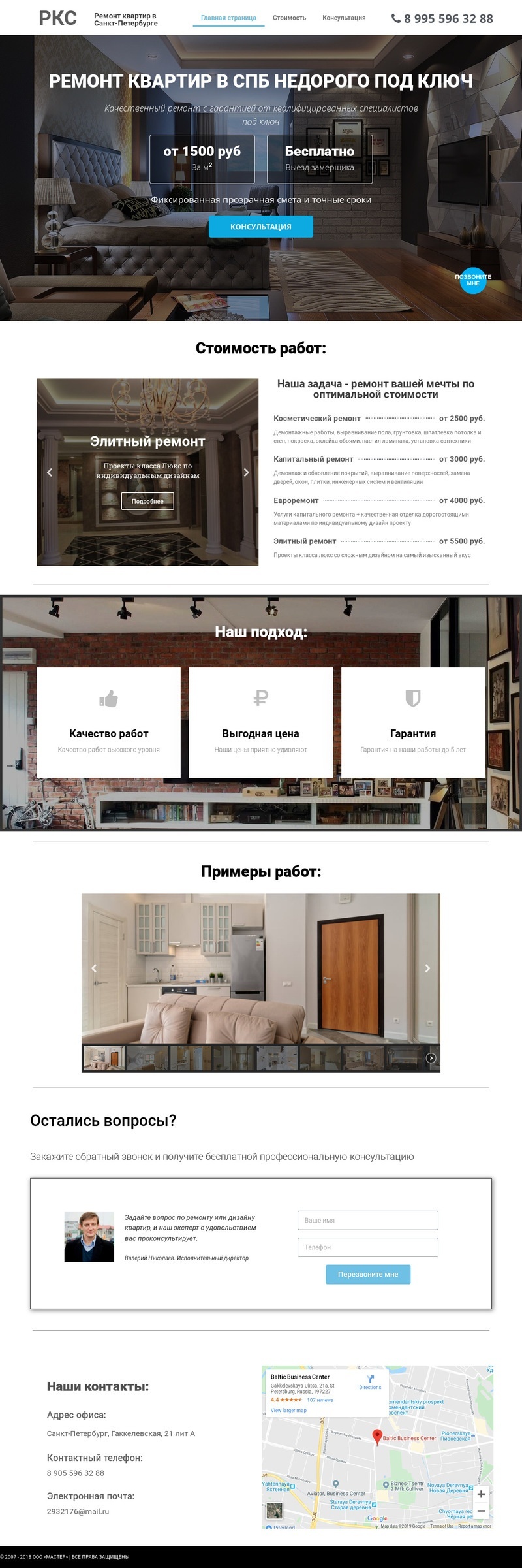 Сайт сделан для компании по ремонту квартир для клиентов с разным уровнем дохода. Через данный сайт вы можете получать заявки на различные виды ремонта от простой комнаты до элитной недвижимости.