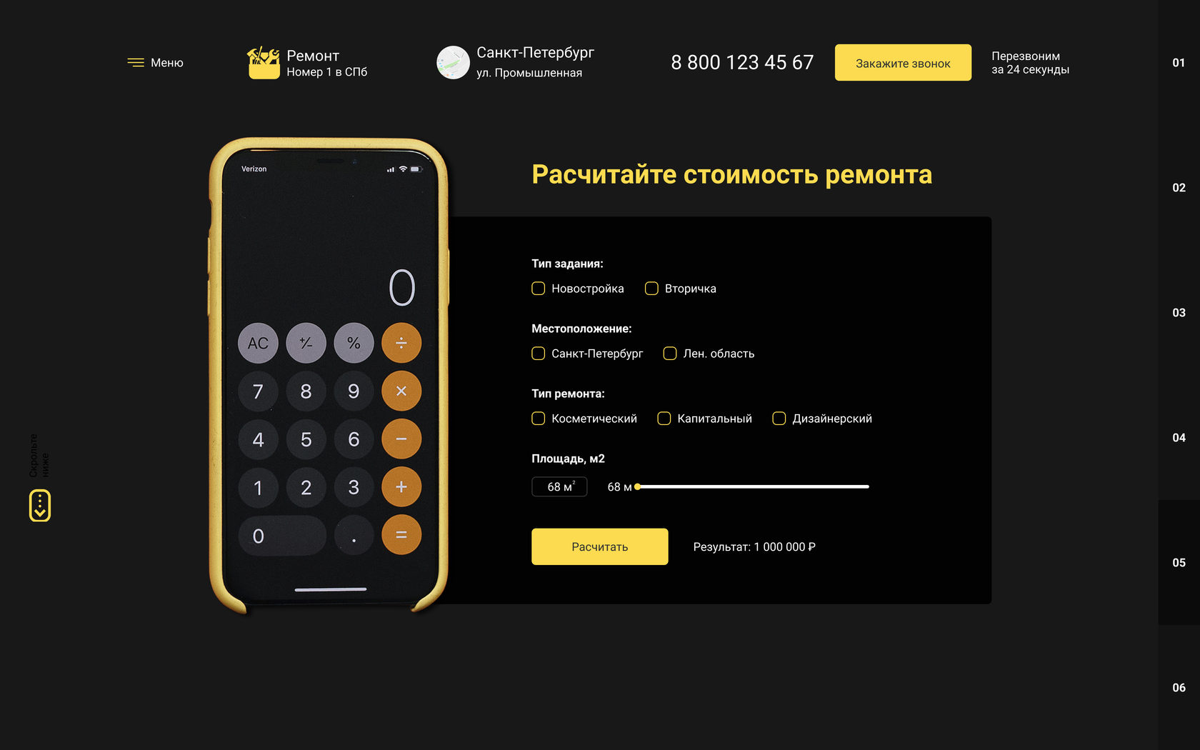 Уникальный сайт разработанный профессиональным дизайнером в программном продукте Figma и сверстанный чистым кодом программистом. Включает в себя интерактивную навигацию, уникальное портфолио, четкая без воды страница усиление клиента а так-же интерактивный онлайн калькулятор для расчета предварительной стоимости ремонта.